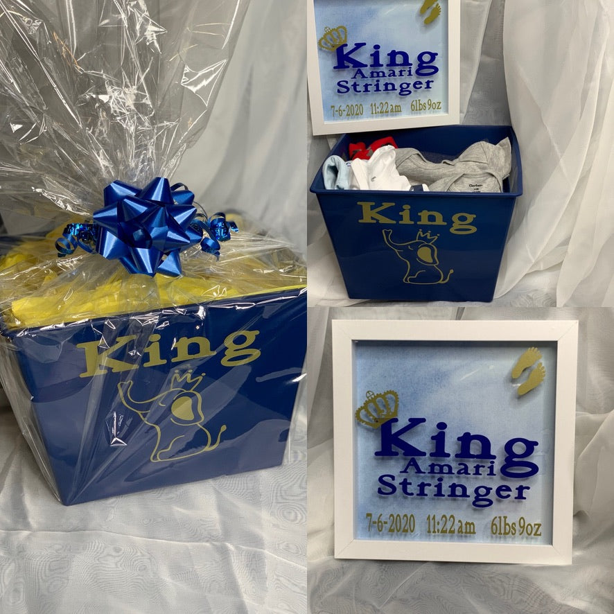 Small Gift Basket includes 2 Outfits- 2 Bibs- 2 Burb Cloths- 2 Hats/ Headbands- 2 Pairs of Socks- 2 Receiving Blankets- 1 Shadow Box Frame With Birth Info all wrapped in a Small Personalized Plastic Basket.