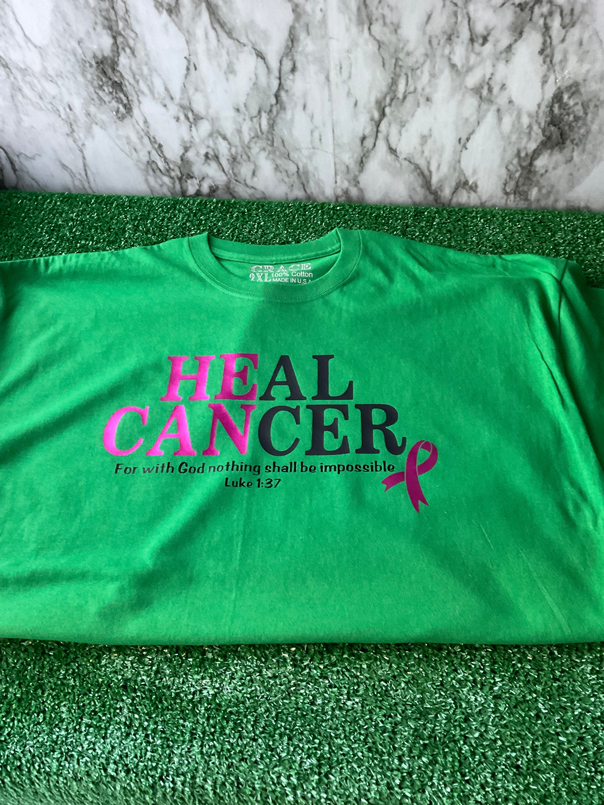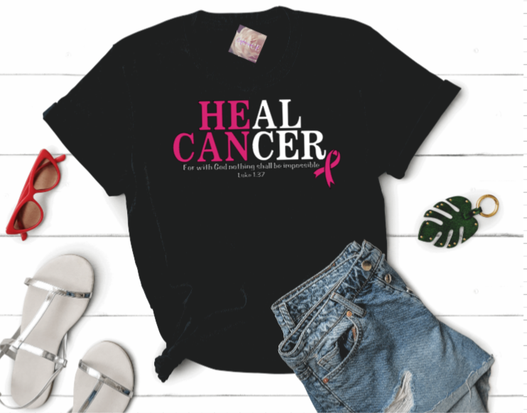 Cancer awareness is not only for October. We are aware every single day and the fight goes on every single day. So we offer this He Can Heal Cancer T-shirt to celebrate the fact that indeed He Can! Comes in green, black and white with reflective pink graphics.