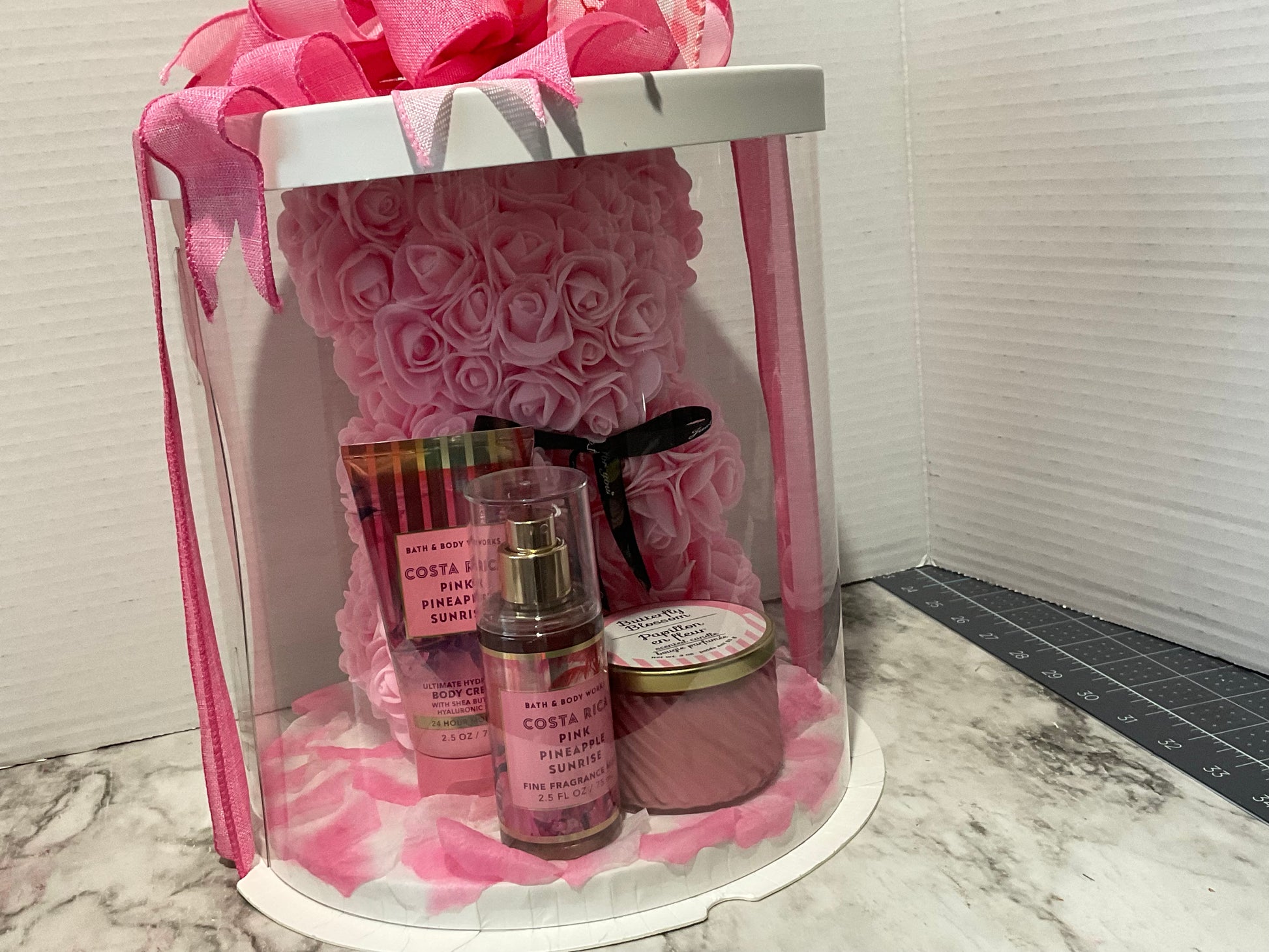 Unleash the power of pink with our Pink Rose Bear ensemble! This delightful set features a cuddly bear, two mini BBW Pineapple Sunrise goodies to make your skin smell like a tropical vacation, and a scented candle nestled in a charming cake box (because who doesn't want dessert that won't go straight to their waistline?). Perfect for gifting or a treat for yourself—because you're worth it, flaunting those rosy vibes!