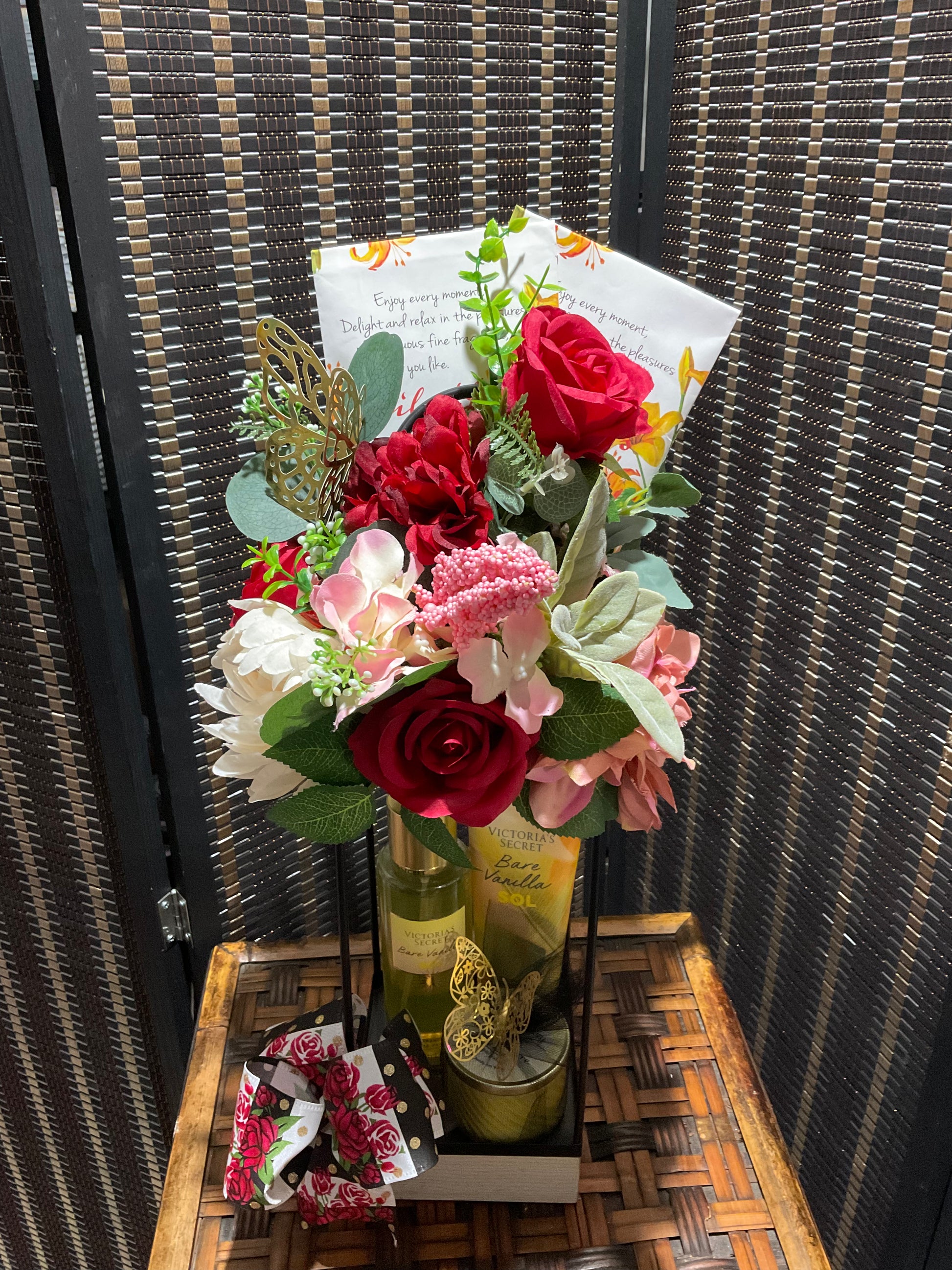 Elevate your sanctuary with this exquisite tall lantern, intricately adorned with enchanting florals, a testament to nature's artistry. Accompanying this enchanting piece are two cherished essentials from Victoria’s Secret: the Bare Vanilla Sol Lotion and spray mist, alongside a delicately scented candle and fragrant sachet packs, all harmonizing to envelop your space in an alluring embrace of warmth and sensuality.